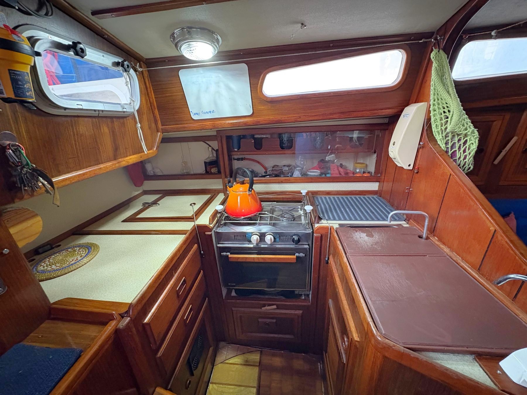 Galley 2-Burner stove and oven, 70L 12V built-in fridge, gas bottle, LPG gas monitor, double sink, manual cold fresh water system.