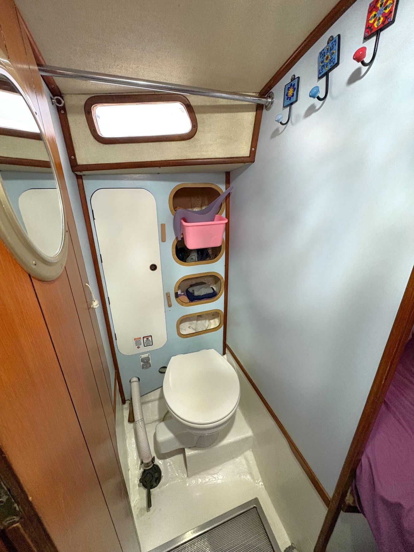 Plumbing 290L Water storage in 2 built-in GRP tanks (saloon) - 125L plus 165L, keel tank is there but open to bilge (can be sealed and used), pressurised hot and cold fresh water system - hot from gas geyser in engine room, 3 bilge pumps - 2 manual and 1 electric.