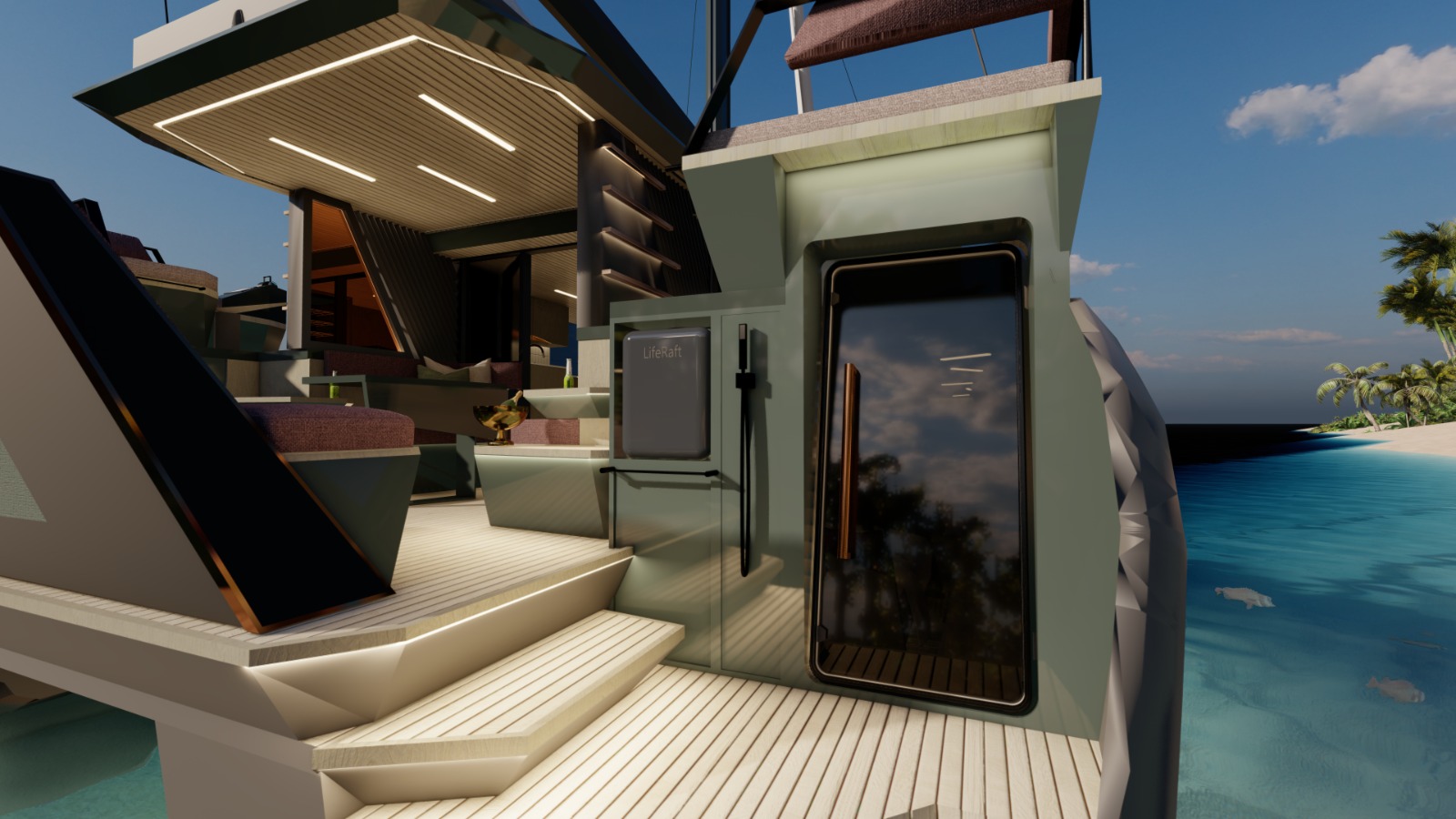 Extras 1 Year structural warranty, owners manual, complete set of equipment manuals, 2 coats gel shield primer, 2 coats ablative anti-fouling, water-tight crash bulkheads in bow, 2 x 230V flatscreen TV’s, 10m Anchor bridle, dingy fixing points in roof, 2 lifting points for tender with load limits, gas BBQ built-in to cockpit (icemaker optional extra), 2 retractable swim ladders.