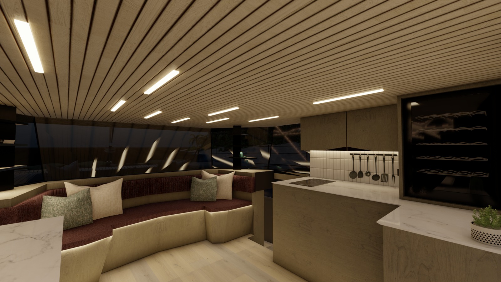 Galley 4-Burner gas hob, microwave, 200L 12V fridge/freezer, optional wine cooler, 2 x 9kg gas bottles with 1 regulator, 1 electronic gas monitor and 1 electronic solenoid valve, double sink, pressurised hot and cold fresh water system.
