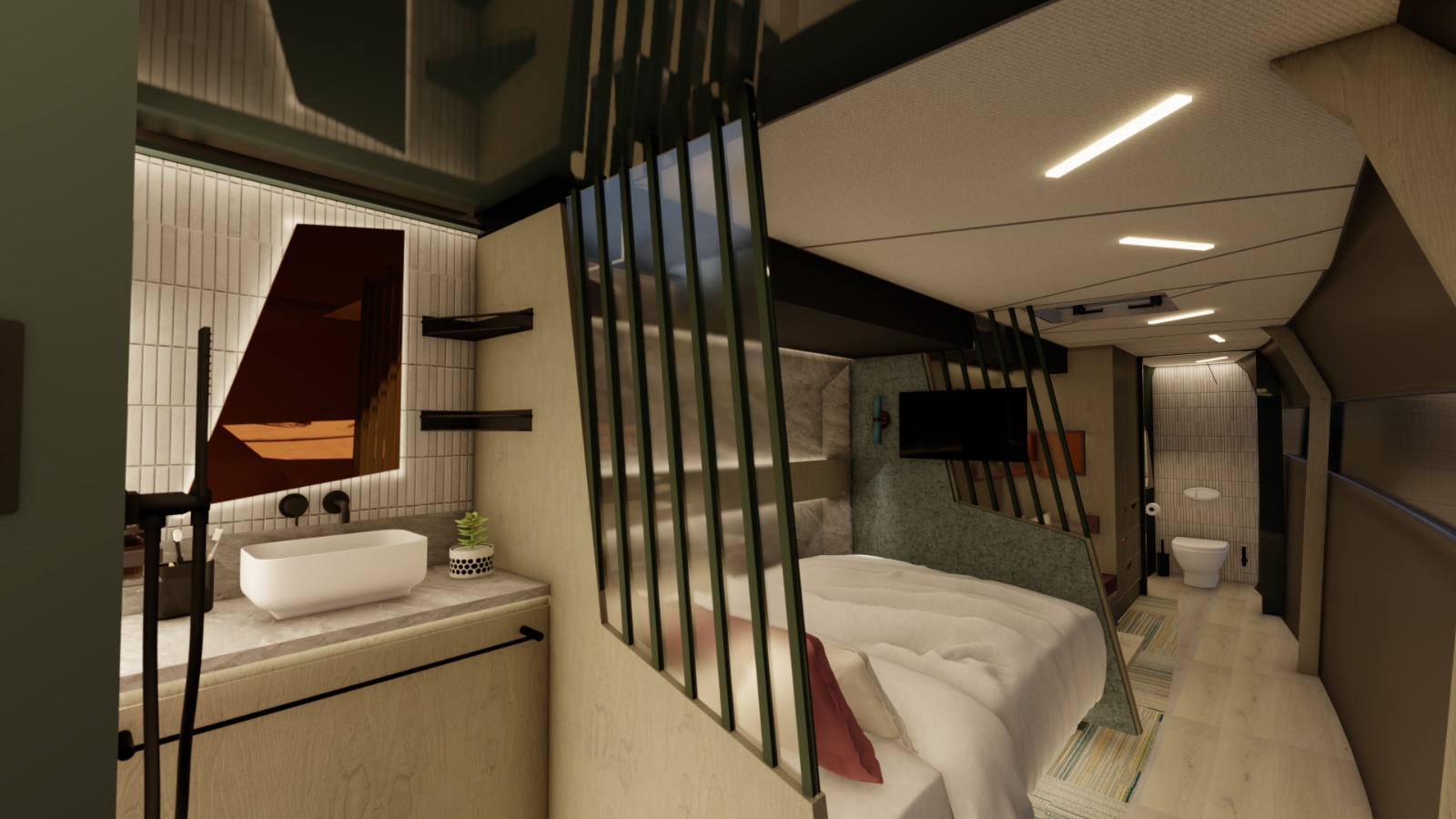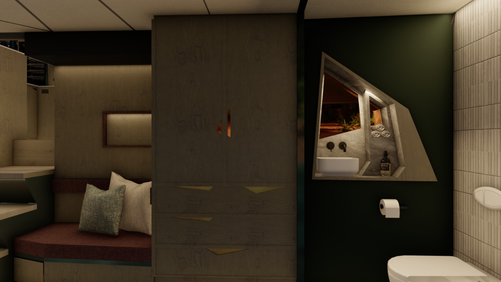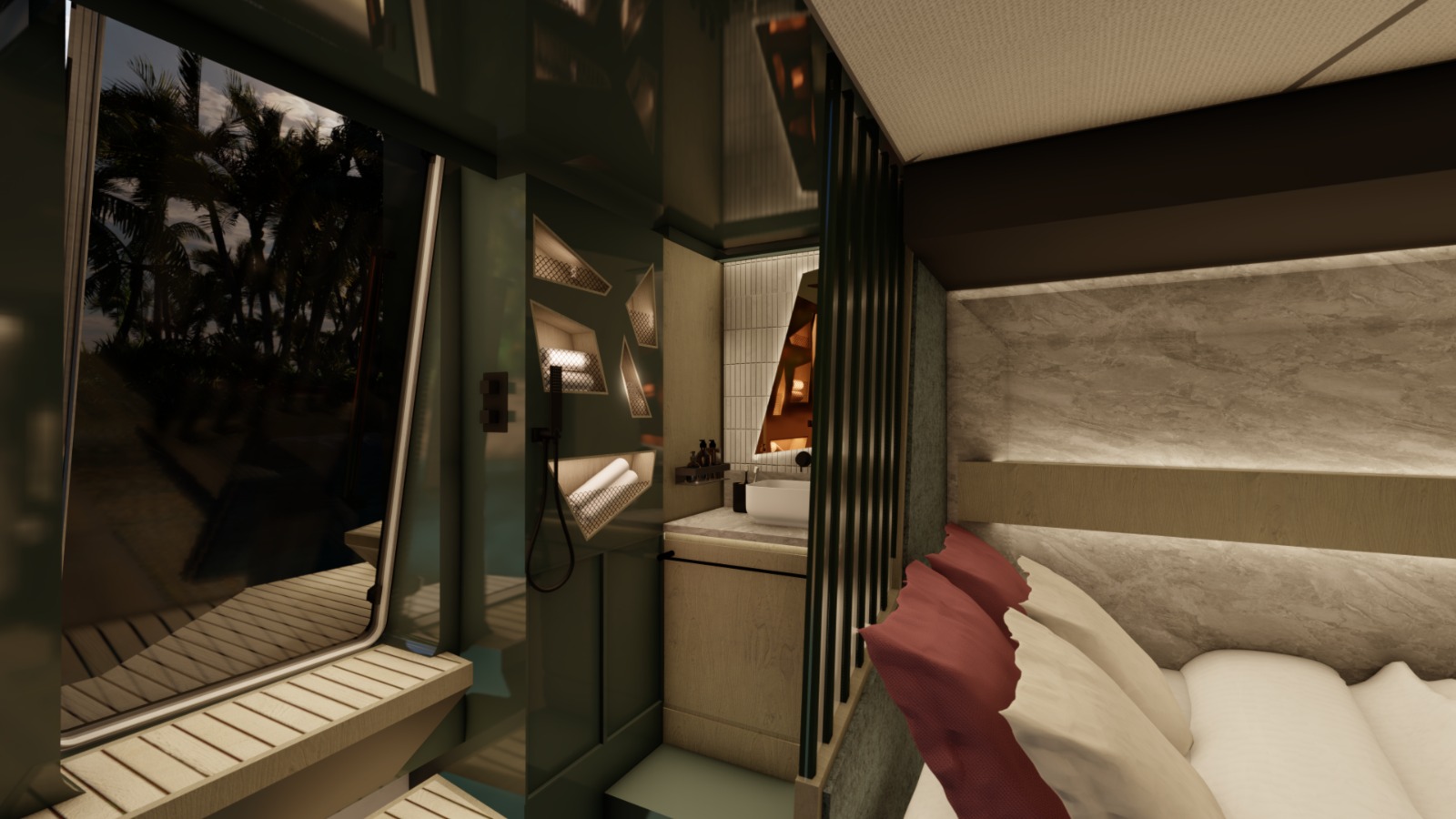 Accommodation Total berths: 4 - 2 Double cabins, 2 electric heads, 2 showers, 4 hand basins, 2 x 88L grey-water tank with level sensors, aircon (optional extra). Choice of three upholstery colours for the interior and exterior, Marine vinyl Conti flooring. The innovative use of a single engine in front of the saloon allows for 2 comfortable and private cabins with studies in each hull with access to the saloon and directly from the transom which is incredible in such a compact vessel. This allows for niceties such as convenient scuba gear stowage to be fitted where you enter from the transom directly into the wet locker / shower area with a separate toilet in the front of the hull.