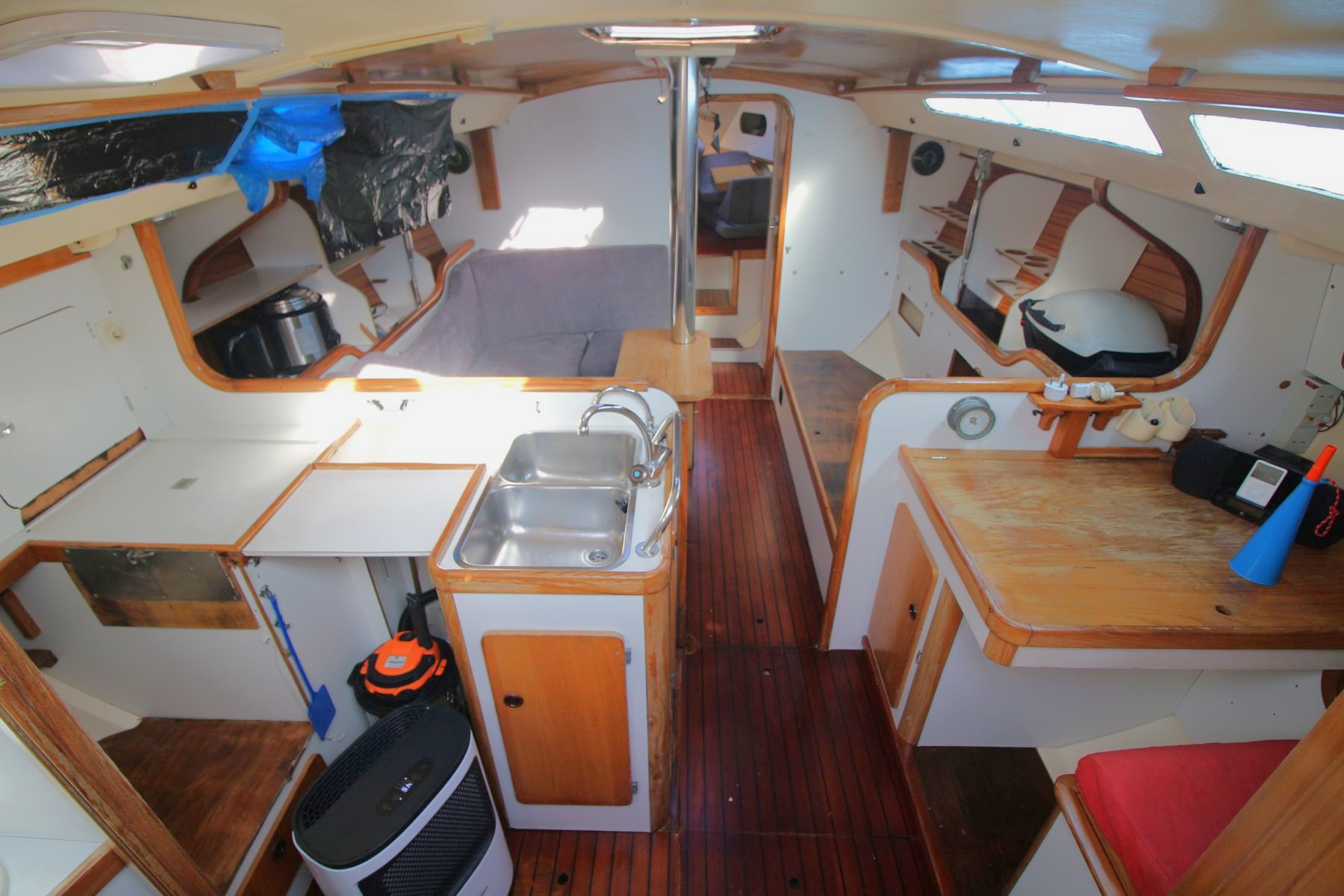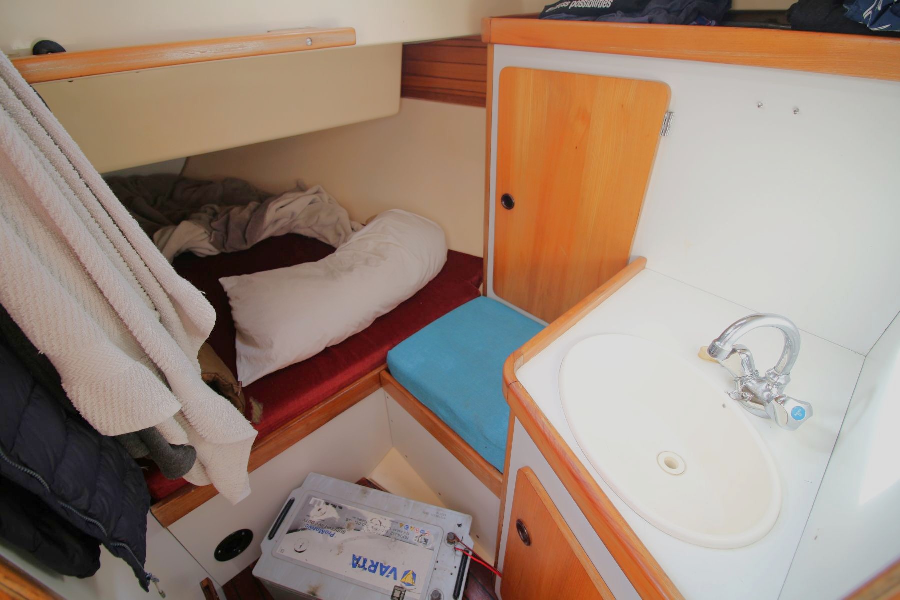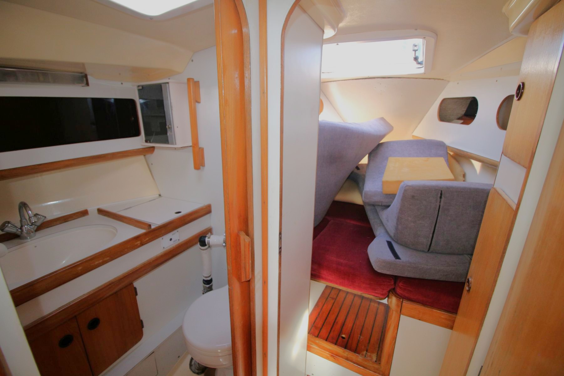 Accommodation Total berths: 6 - 3 Double cabins, electric heads (1 needs checking), 3 hand basins, veneer ply floor. A very comfortable light and well appointed interior with good stowage and headroom. Two aft cabins with sinks which were plumbed for pressurised cold water. Appears that the interior is still in good useable condition mainly needing the woodwork sanded and varnished.