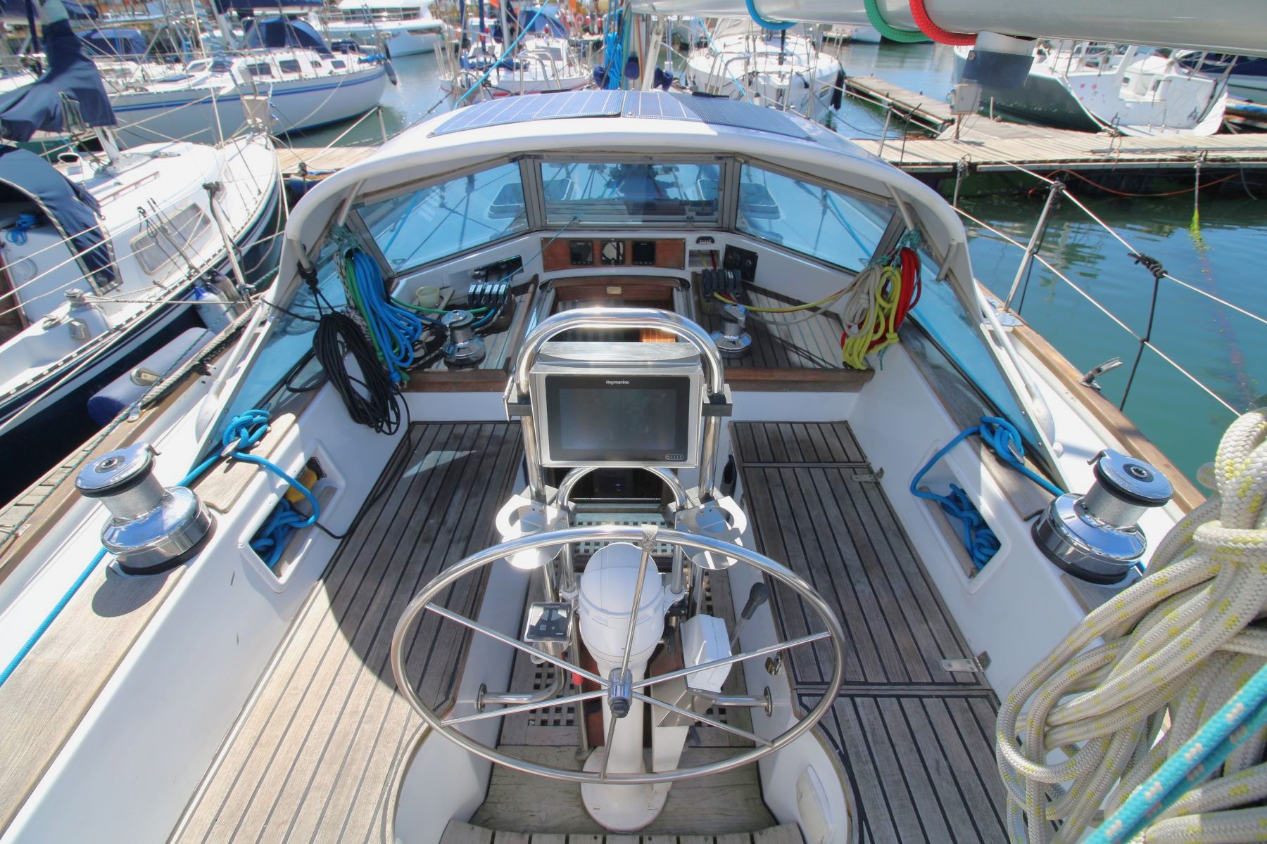 Steering Pedestal wheel cable steering, emergency tiller, Raymarine i70 head (2022), Autohelm Linear drive, Hydrovane wind vane.