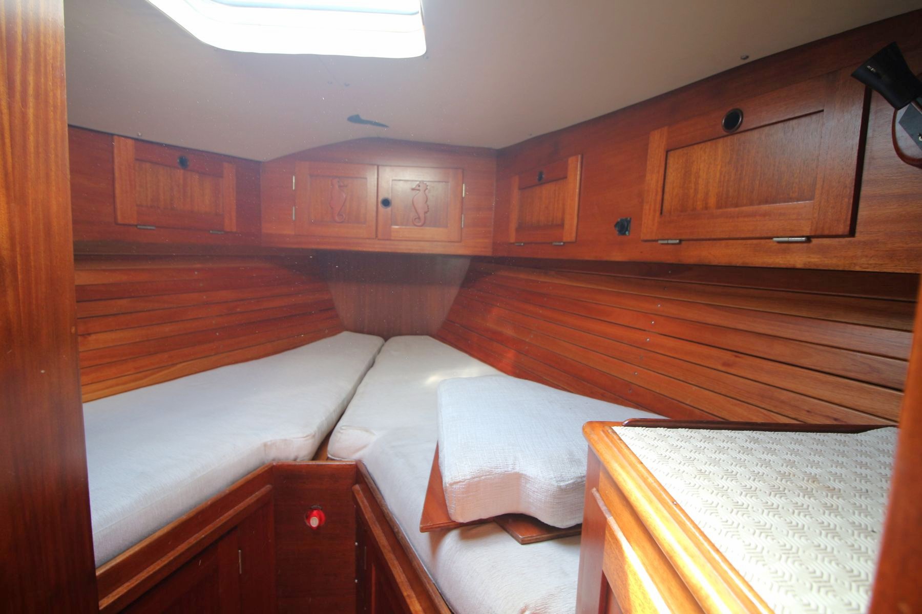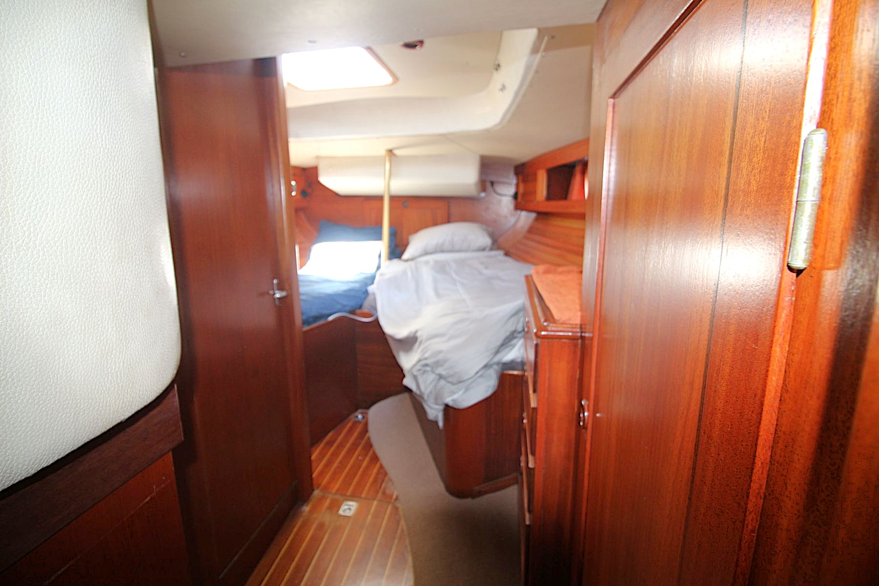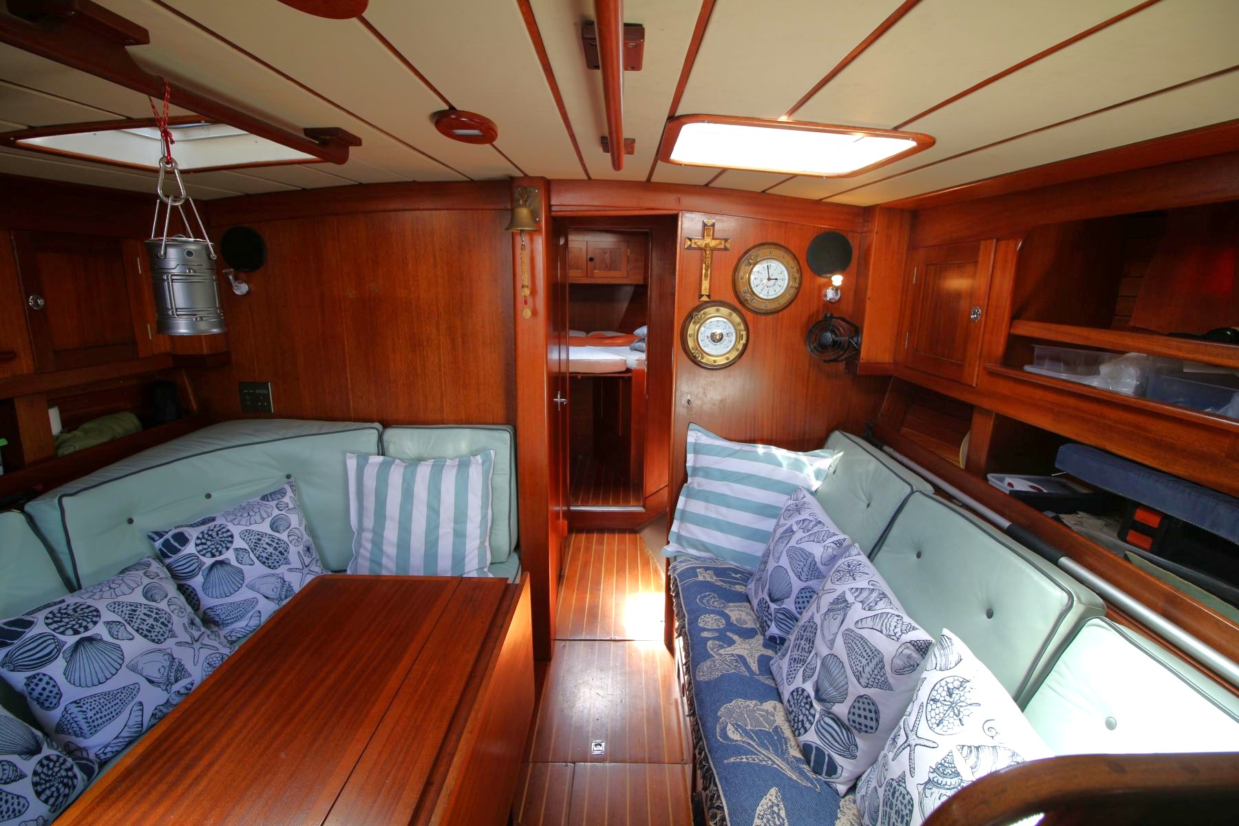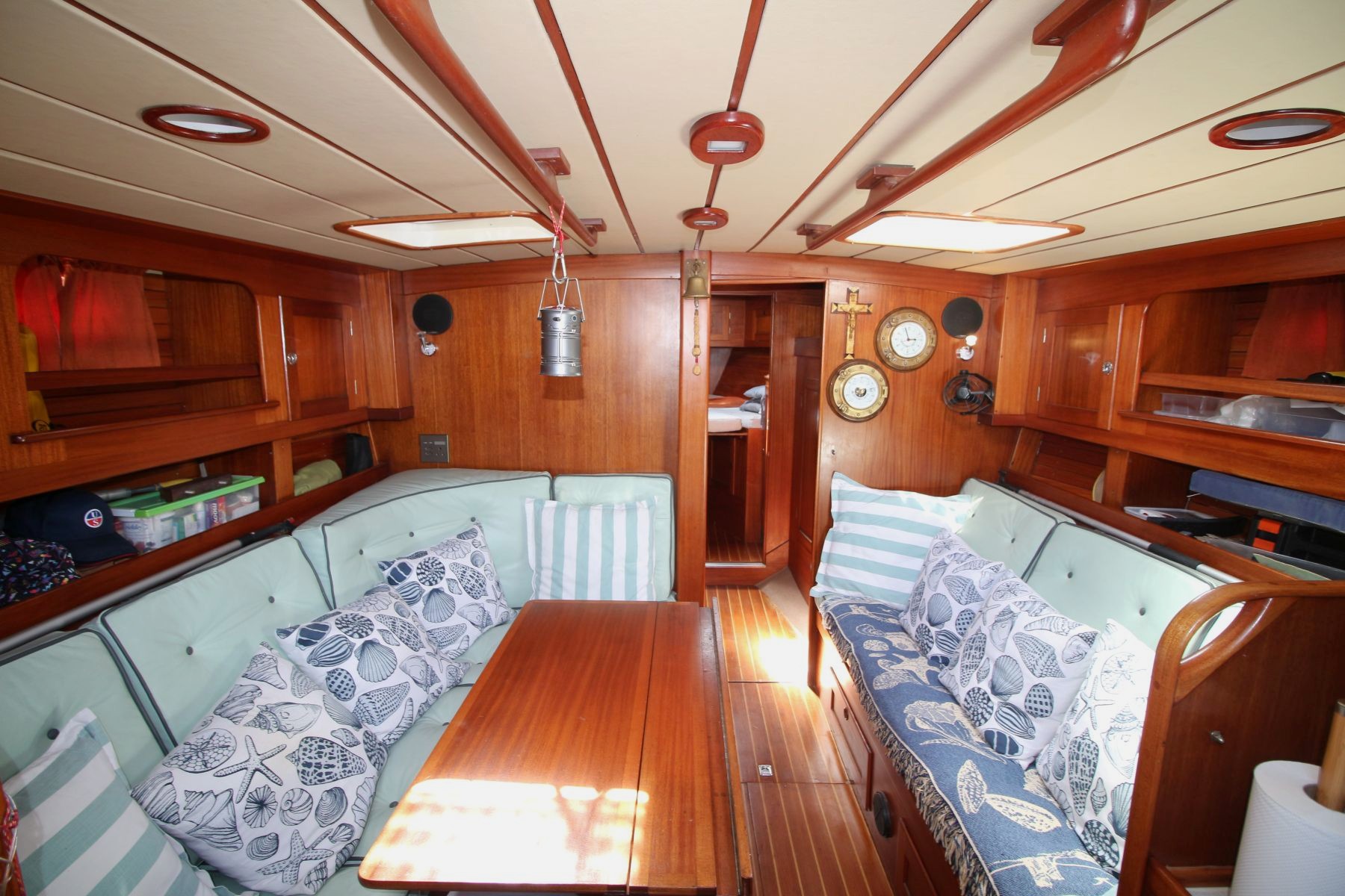 Accommodation Total berths: 5 - 2 Cabins. 2 Double and 1 single berth, 2 heads - manual and electric (2025), shower, 2 hand basins, new Hansgrohe fittings at shower basins, leather upholstery, new cushions, Teak and Holly floor. Well maintained original interior with gorgeous wooden finishes which have been unobtrusively modernised with LED lights in the saloon and cabins.