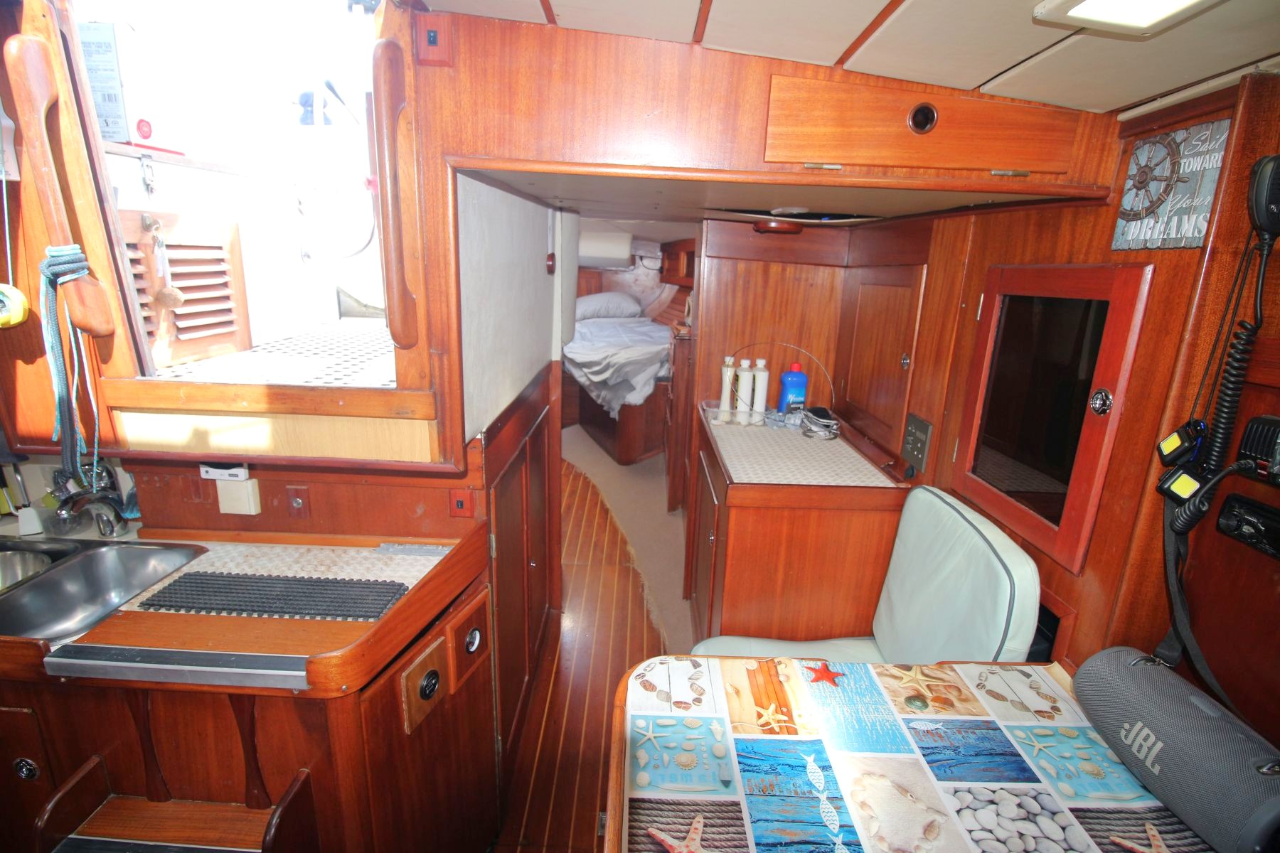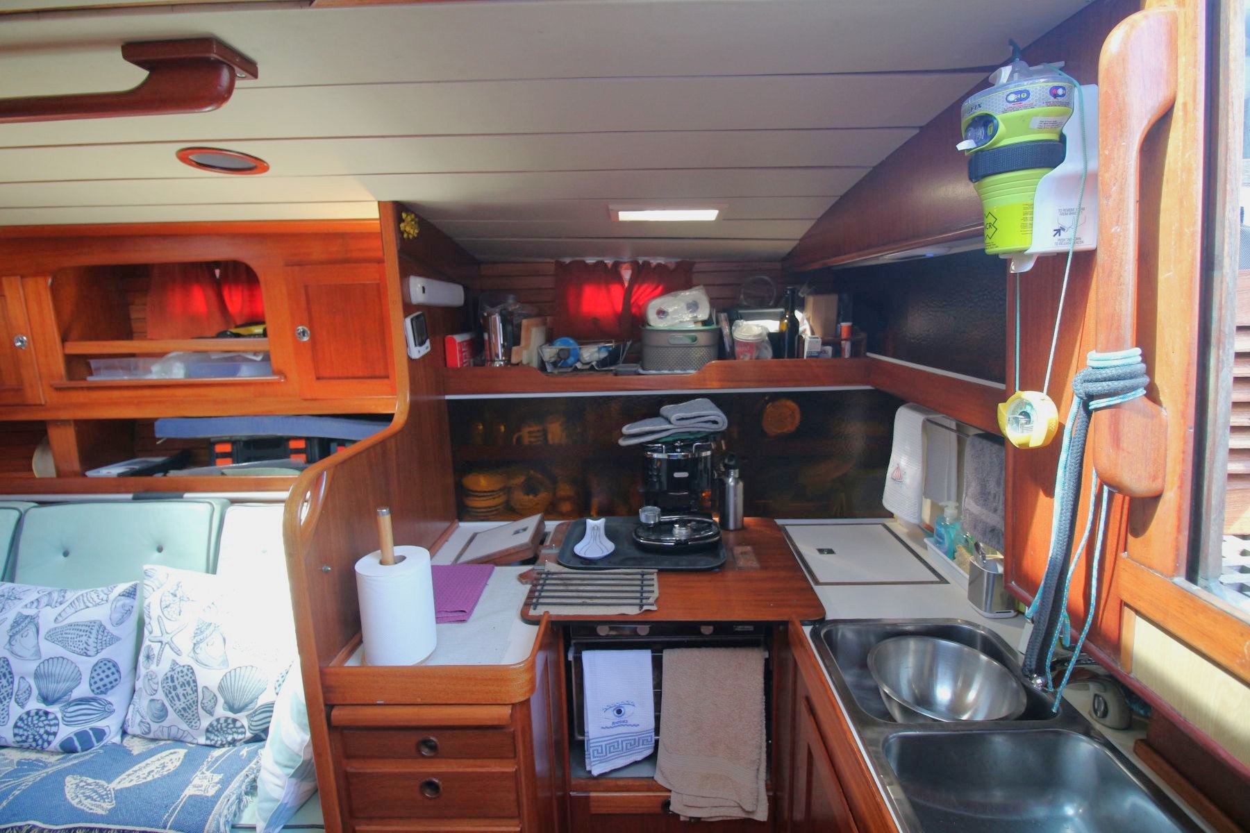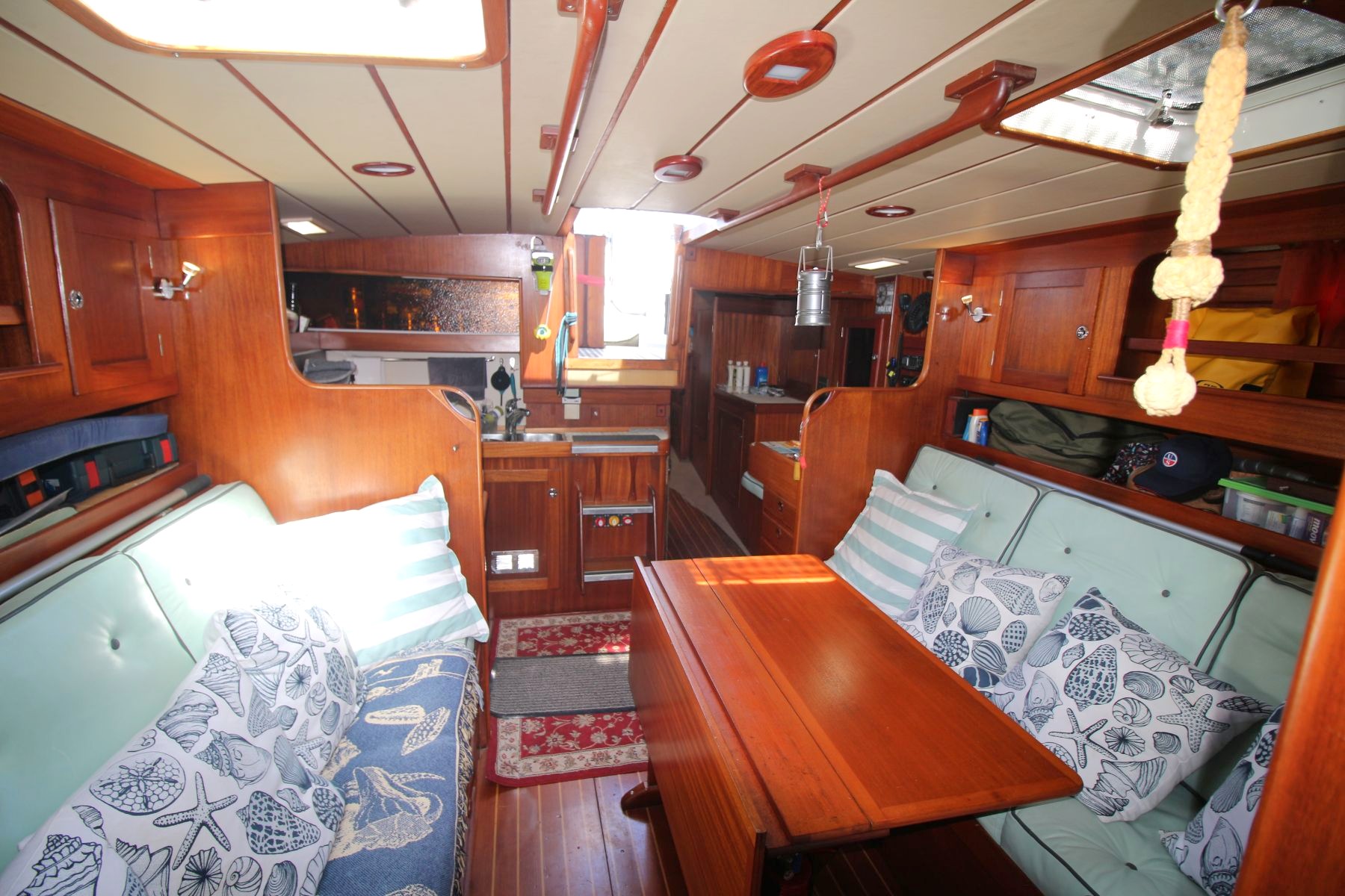 Galley Total berths: 5 - 2 Cabins. 2 Double and 1 single berth, 2 heads - manual and electric (2025), shower, 2 hand basins, new Hansgrohe fittings at shower basins, leather upholstery, new cushions, Teak and Holly floor. Well maintained original interior with gorgeous wooden finishes which have been unobtrusively modernised with LED lights in the saloon and cabins.