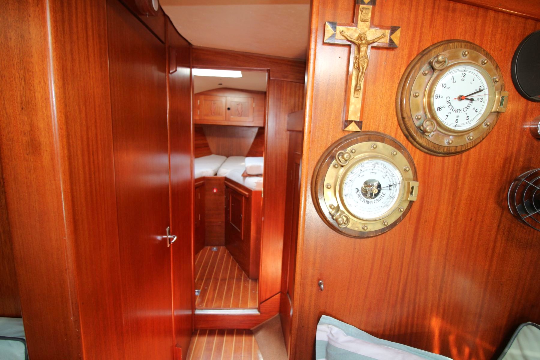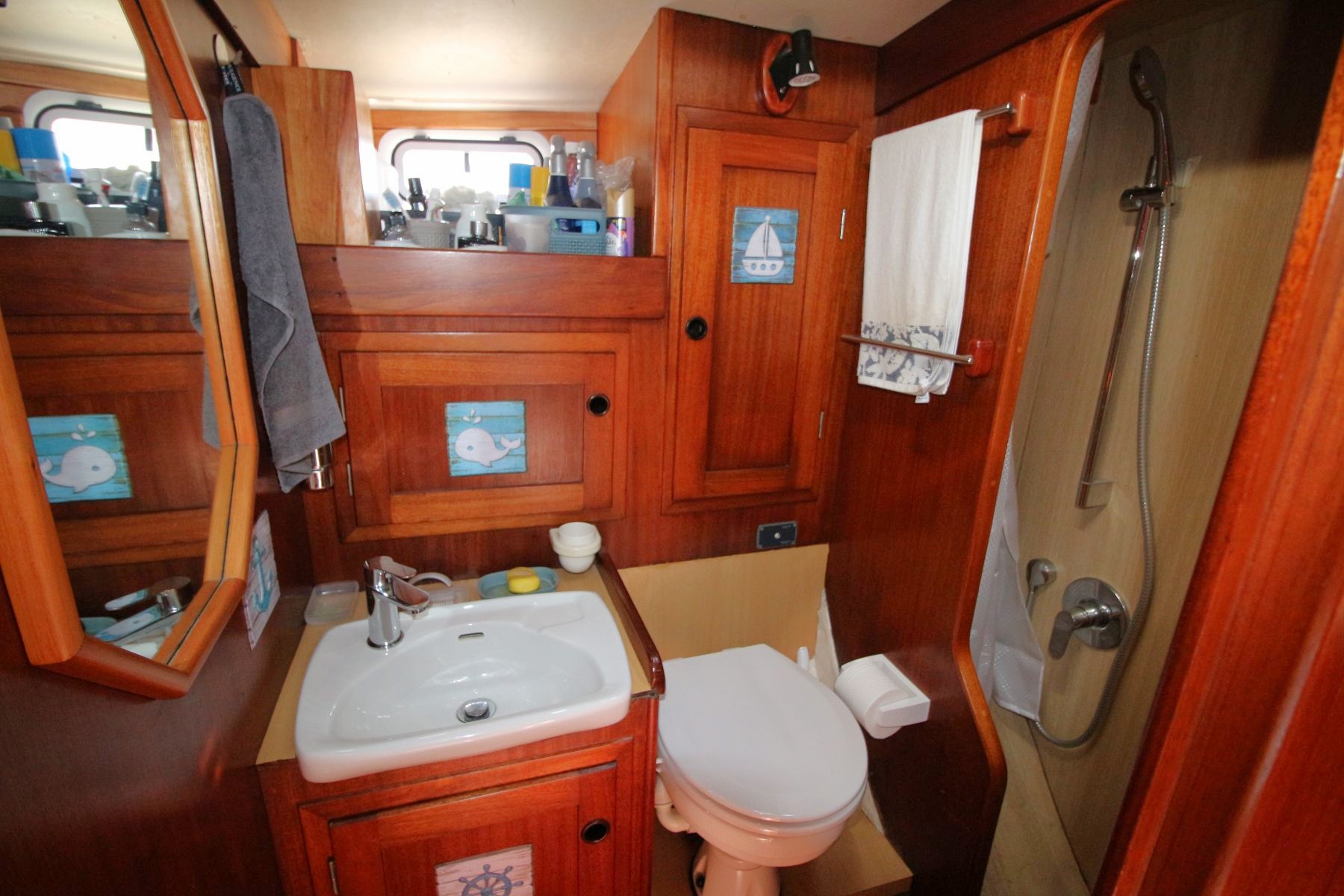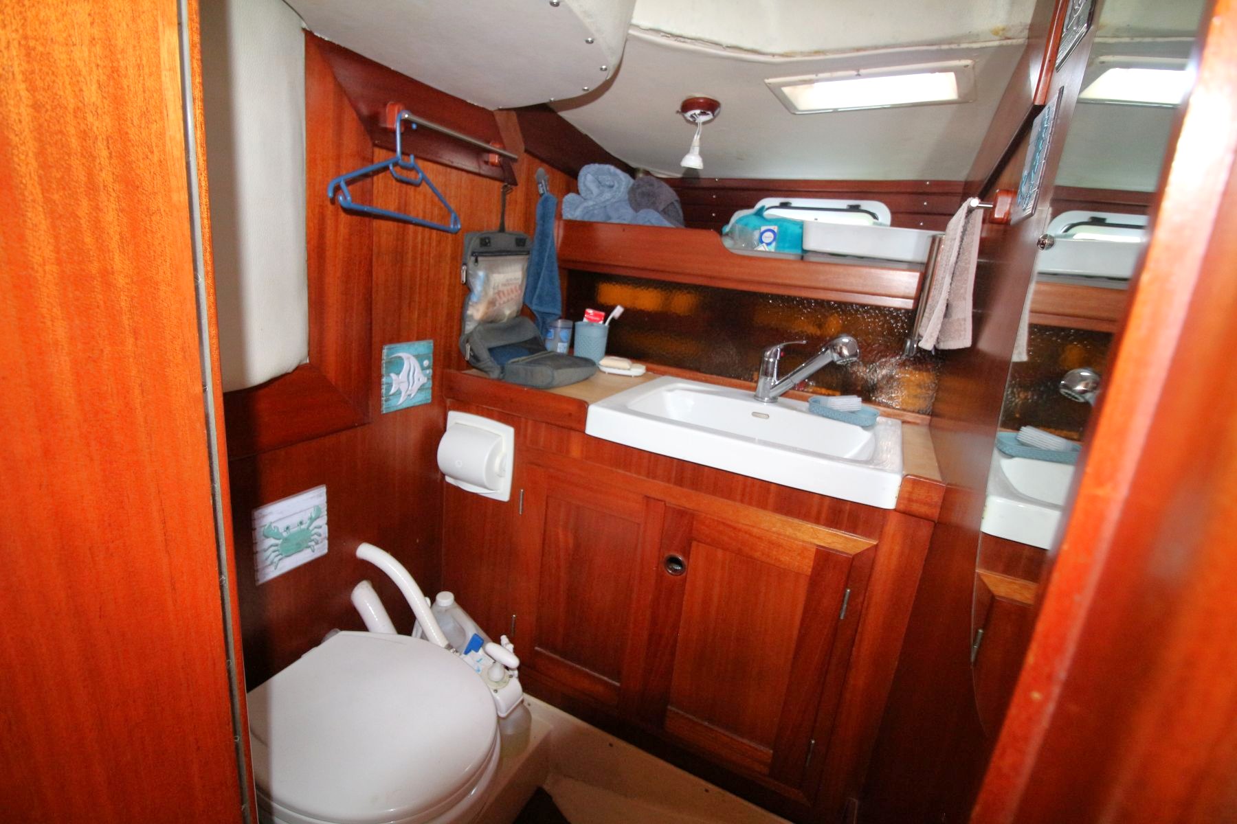 Galley Total berths: 5 - 2 Cabins. 2 Double and 1 single berth, 2 heads - manual and electric (2025), shower, 2 hand basins, new Hansgrohe fittings at shower basins, leather upholstery, new cushions, Teak and Holly floor. Well maintained original interior with gorgeous wooden finishes which have been unobtrusively modernised with LED lights in the saloon and cabins.