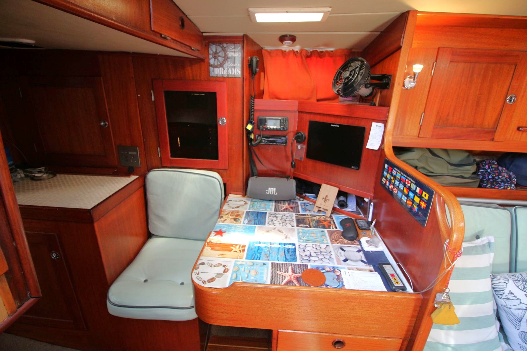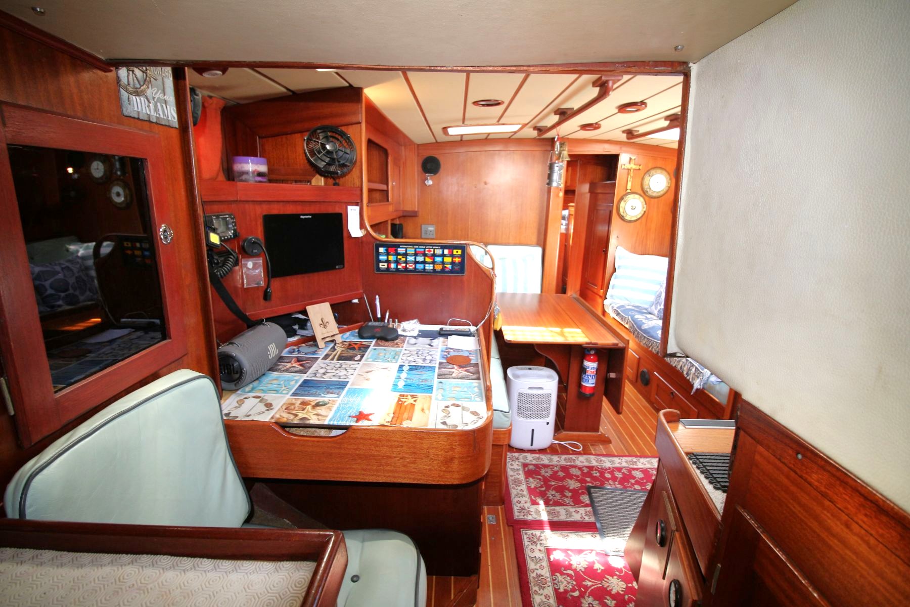 Electrics Icom IC-M4230 GPS VHF base station, Raymarine Axion 9” GPS chart plotter (2022), Raymarine; echo sounder, log and wind instruments, 2 Raymarine i70 repeaters (2022), Binnacle compass, 2 SmartSolar charge controllers (BT/Wi-Fi), 2 x 380W solar panels, 2 Lynx 1000DC distributors, Orion-Tr Smart (BT/Wi-Fi) 12/12-30 isolated DC/DC charger, Smart Battery protect 12.24 200 (BT/Wi-Fi), Victron 3000W 120A 220V inverter, Cerbo GX (TW/Wi-Fi) COMMUNICATION CENTRE, Cyrix-ct 12/24A intelligent battery combiner, clock, barometer. Boat has been extensively rewired since 2022 with new Victron units, tinned wiring, 12 and 220V DB boards and lighting redone.