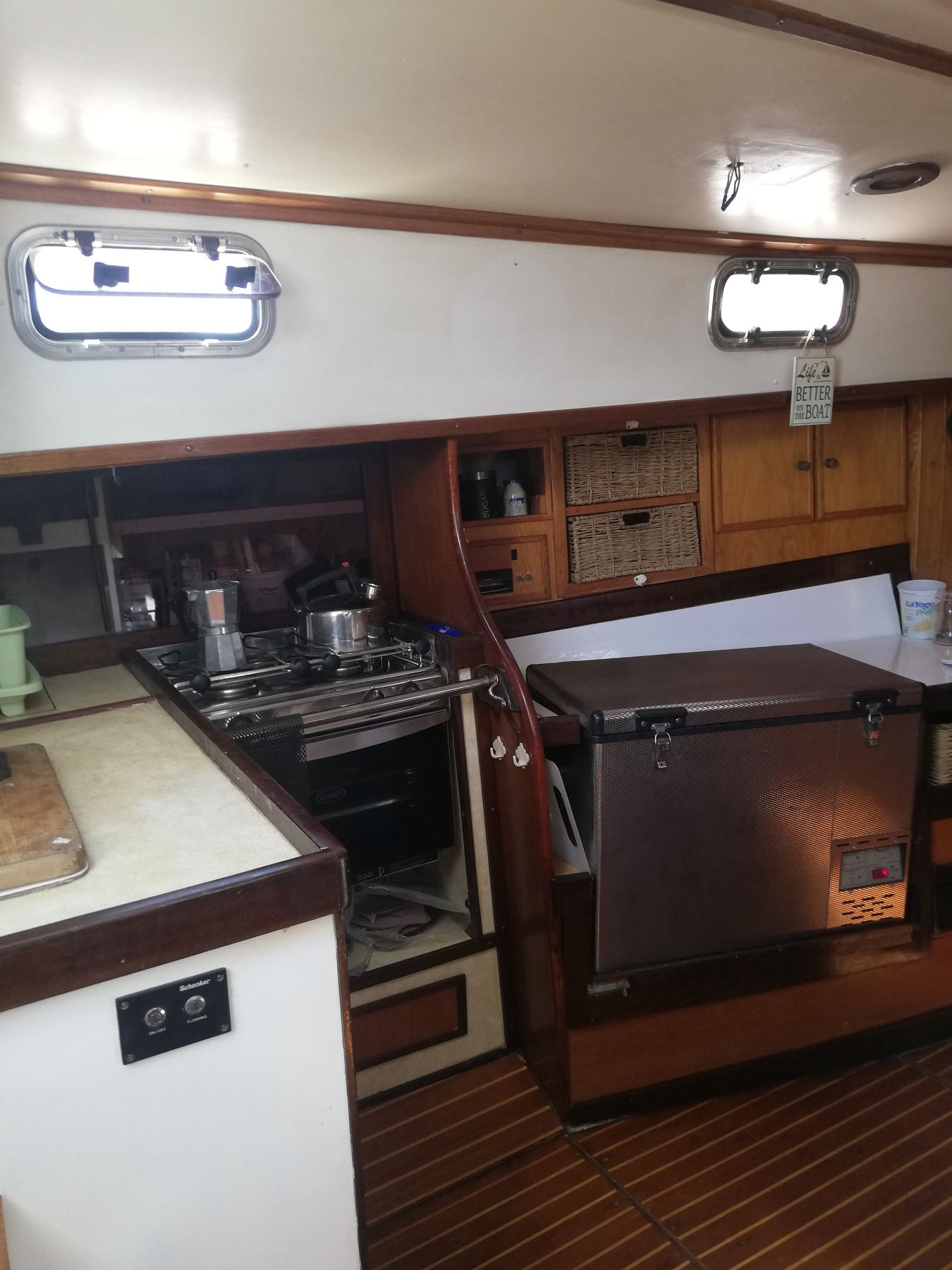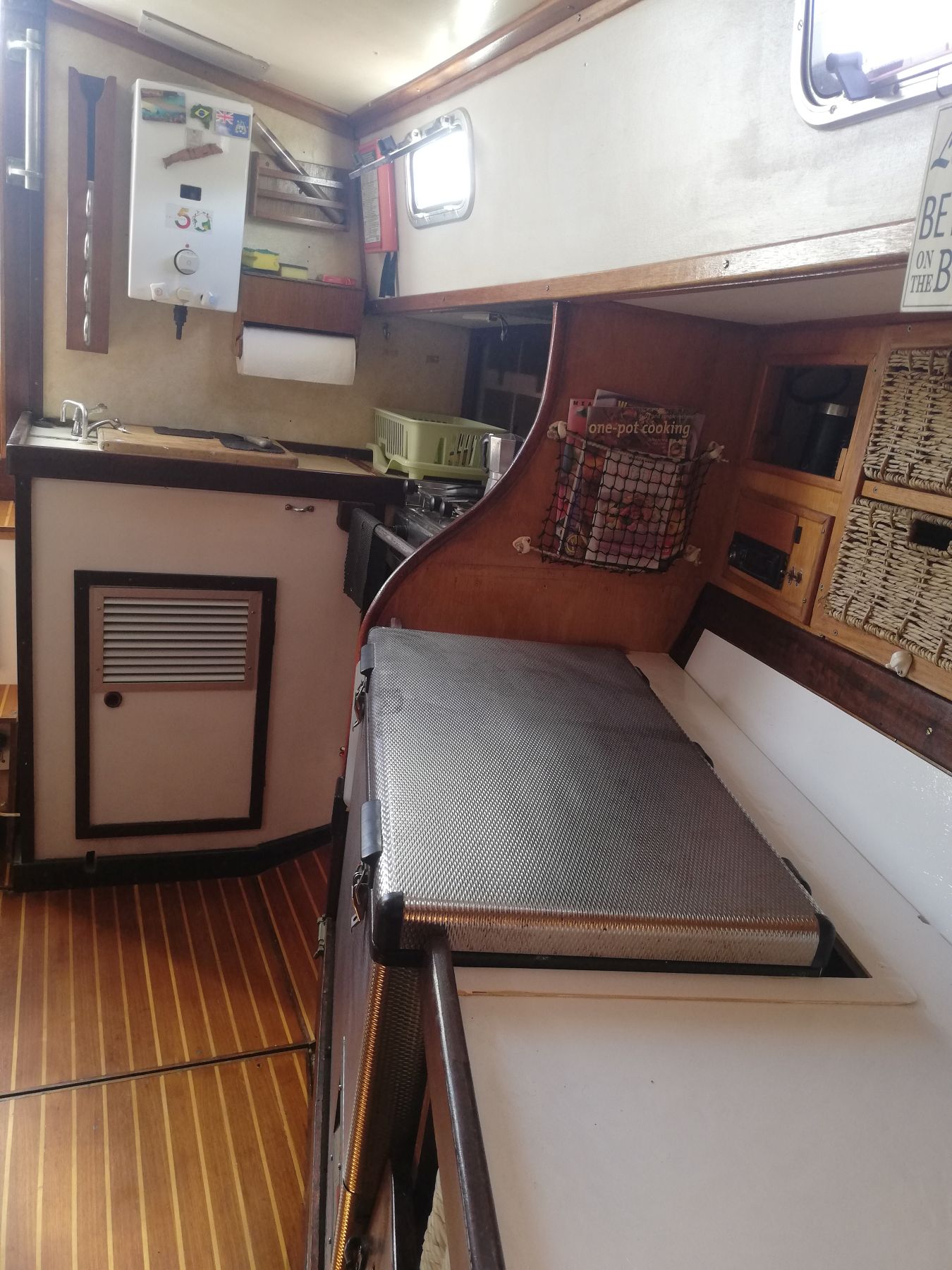 Galley 2-Burner stove and oven, fridge, 70L Lumar freezer (12/22V), 2 gas bottles, single GRP sink, pressurised hot and cold fresh and manual salt water system.